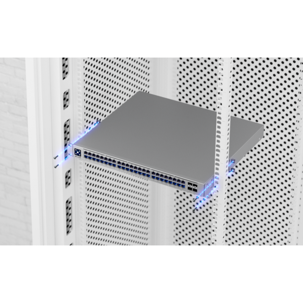 Коммутатор способен питать требовательные устройства, такие как точки доступа, IP-камеры и VoIP-телефоны, с мощностью до 60 Вт на порт PoE++. Подсвеченные порты Etherlighting облегчают идентификацию местоположения порта, скорости/соединения и сети VLAN. Работа устройства при отключении электроэнергии поддерживается за счет резервного питания постоянного тока. Управление и настройка коммутатора производятся через единый интерфейс Ubiquiti UniFi Network Controller.